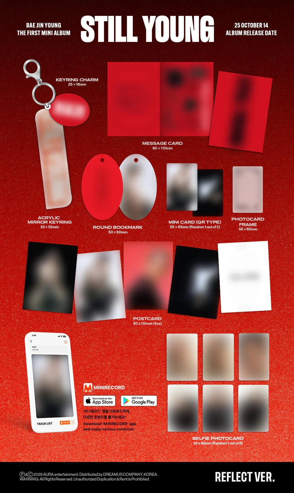 Este lanzamiento presenta cuatro ediciones del primer mini álbum Still Young de BaejinYOUNG, disponible en variantes Plataforma y Estándar con los temas Reflect y Shining.