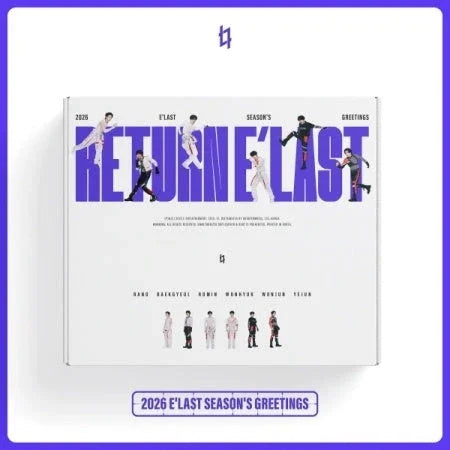 E'LAST 2026 SEASON'S GREETINGS: RETURN E'LAST is a retrospective collection celebrating the moments and growth since the group's debut in 2020. The set combines past and present styles in a flowing narrative, featuring a desk calendar, film-roll stickers, calendar photo cards, calendar posters, and an acrylic photo frame. Contents may vary by edition.