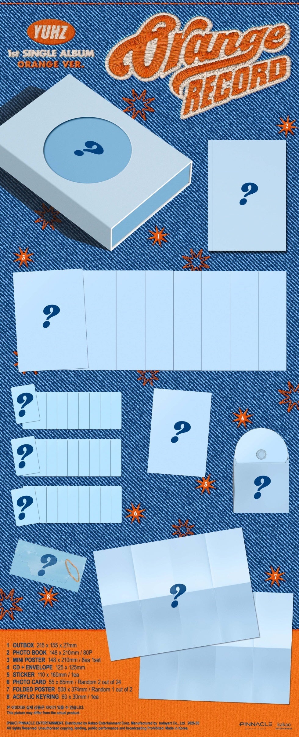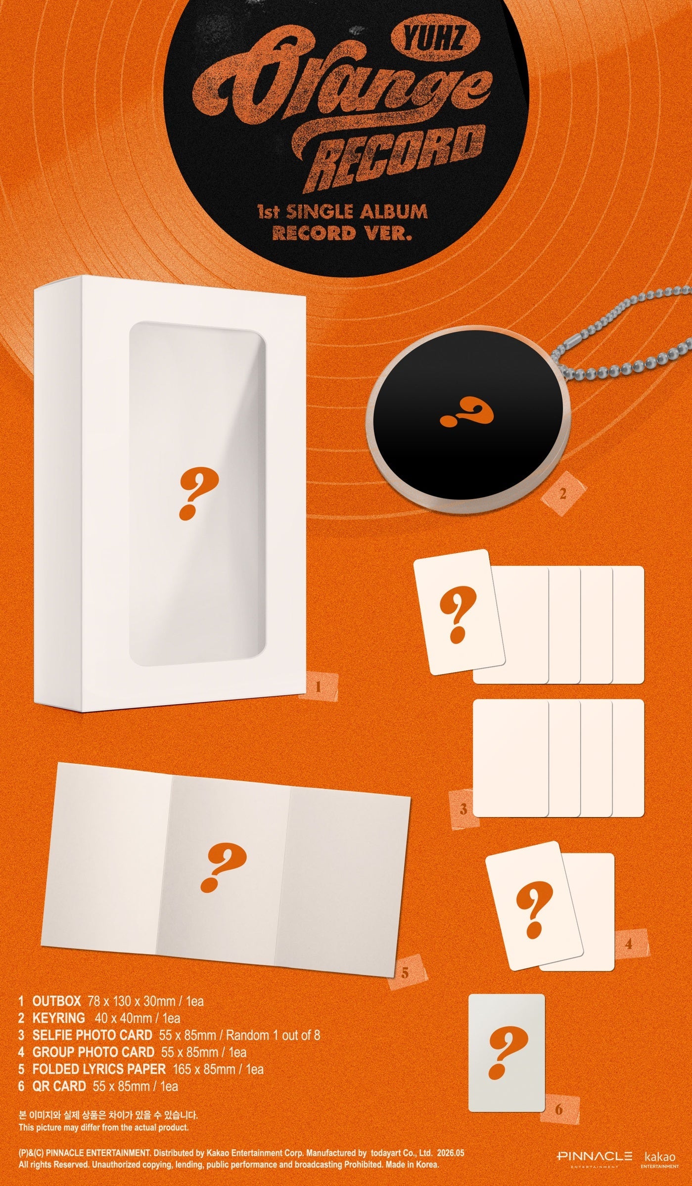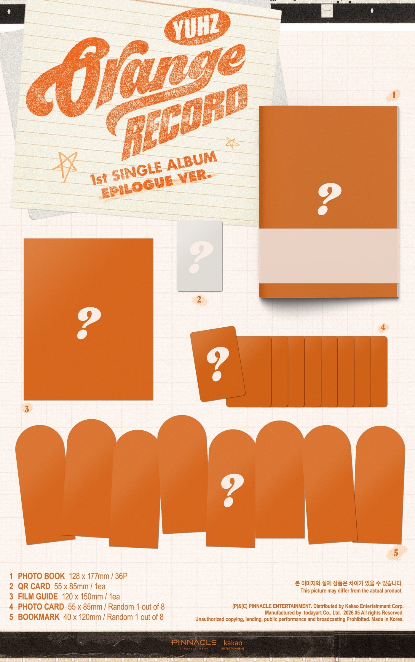 YUHZ's Orange Record 1st Single Album is available in three versions: Orange, Epilogue, and Record. Contents vary by version.